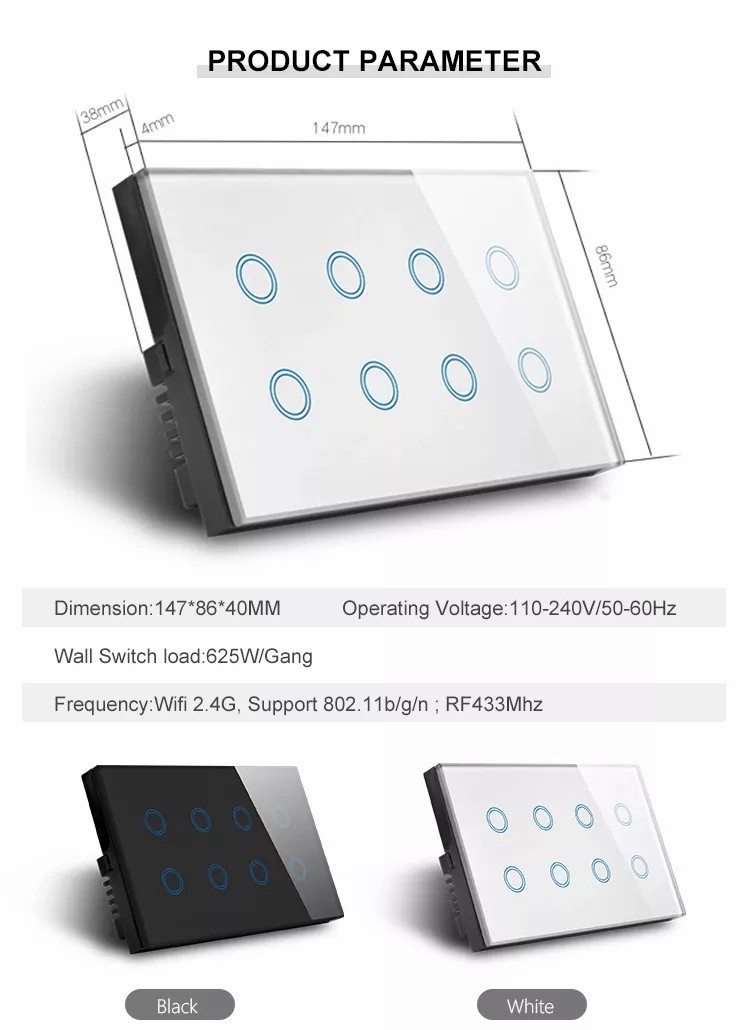 Tempered glass touch screen of this diy smart switch is sensitive to the touch of control, premium durable glass material provides up to 20 million touch figures through our rigorous testing